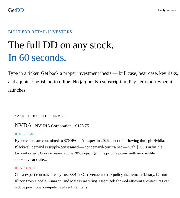 1. Type any ticker — stocks, ETFs, or crypto. NVDA, AAPL, QQQ, BTC, whatever you're researching.2. GetDD pulls live data — financials, recent news, analyst estimates, and risk factors, all synthesised automatically.3. You get the full thesis — bull case, bear case, valuation snapshot, key risks ranked by severity, and a bottom line that actually takes a position.4. Save, share, or decide — download as a PDF or share the link. Post it in your investing community. Or just use it to make a smarter call.